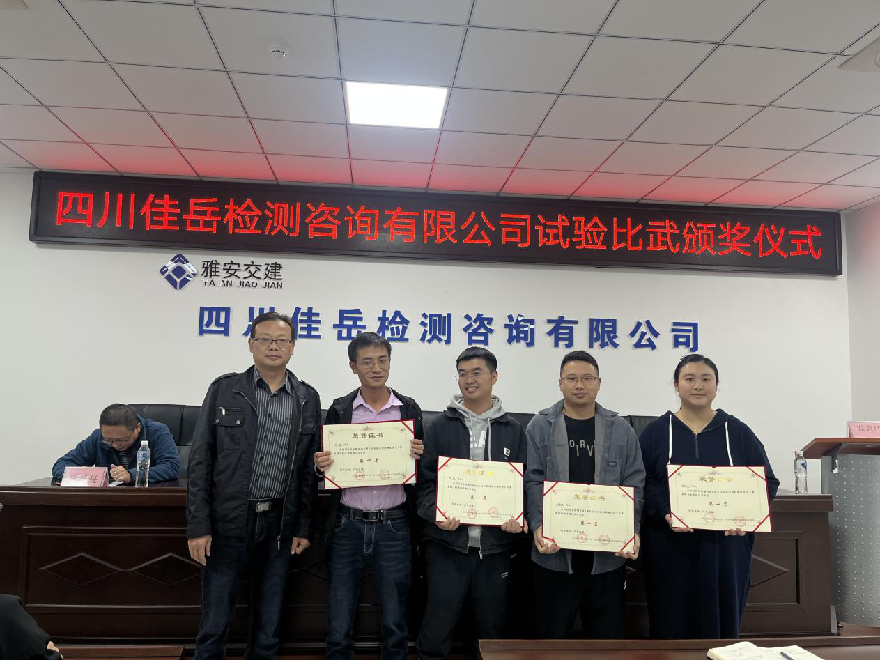 11月8日,雅安交建集團(tuán)所屬四川佳岳檢測(cè)咨詢(xún)有限公司舉行頒獎(jiǎng)典禮,對(duì)第一屆試驗(yàn)檢測(cè)技能比武大賽進(jìn)行總結(jié)和表彰。