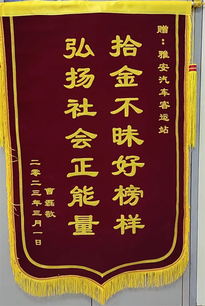 經過幾日的多方式查詢失主信息,終于電話聯(lián)系到遠在河北省的曹磊先生,在核實失主的身份和包內物品信息無誤后,車站通過郵寄錢包及卡、微信轉賬現(xiàn)金的方式歸還失主。面對失而復得的錢包,曹先生對拾到錢包的例檢員劉孝康和車站領導表達了誠摯的謝意。3月6 日車站收到曹磊先生郵寄的“拾金不昧好榜樣 弘揚社會正能量”的錦旗。