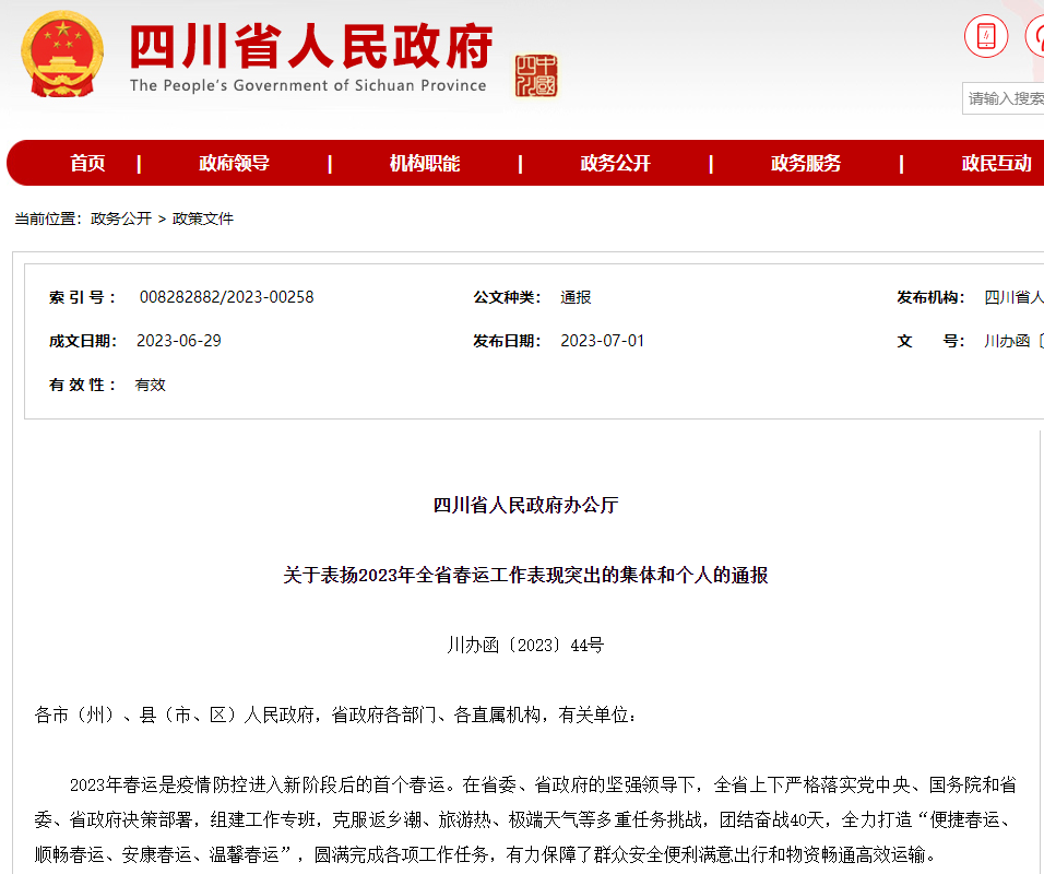 近日,四川省人民政府辦公廳印發(fā)《關于表揚2023年全省春運工作表現(xiàn)突出的集體和個人的通報》,四川蜀通運業(yè)有限公司榮獲 “2023年全省春運工作表現(xiàn)突出集體”稱號。