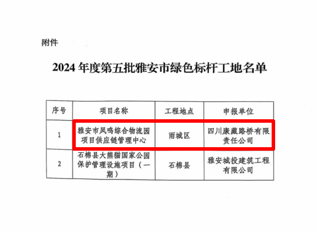 近日,由雅安交建集團(tuán)康藏路橋公司建設(shè)的鳳鳴綜合物流園項目供應(yīng)鏈管理中心,經(jīng)市住建局、市生態(tài)環(huán)境局、市城管執(zhí)法局聯(lián)合評審小組綜合考評,被評為雅安市綠色標(biāo)桿工地。