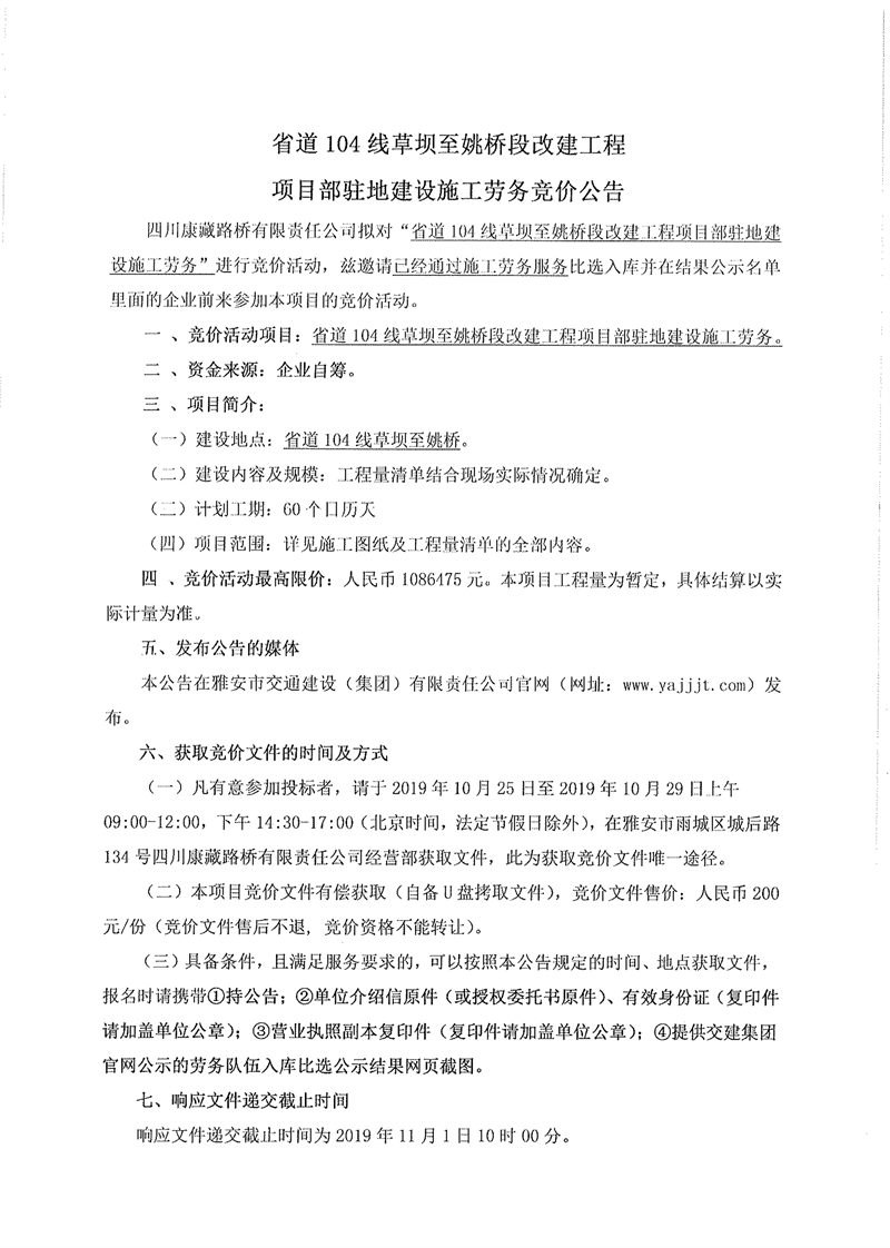 四川康藏路橋有限責(zé)任公司省道104線草壩至姚橋段改建工程項(xiàng)目部駐地建設(shè)施工勞務(wù)競價(jià)公告