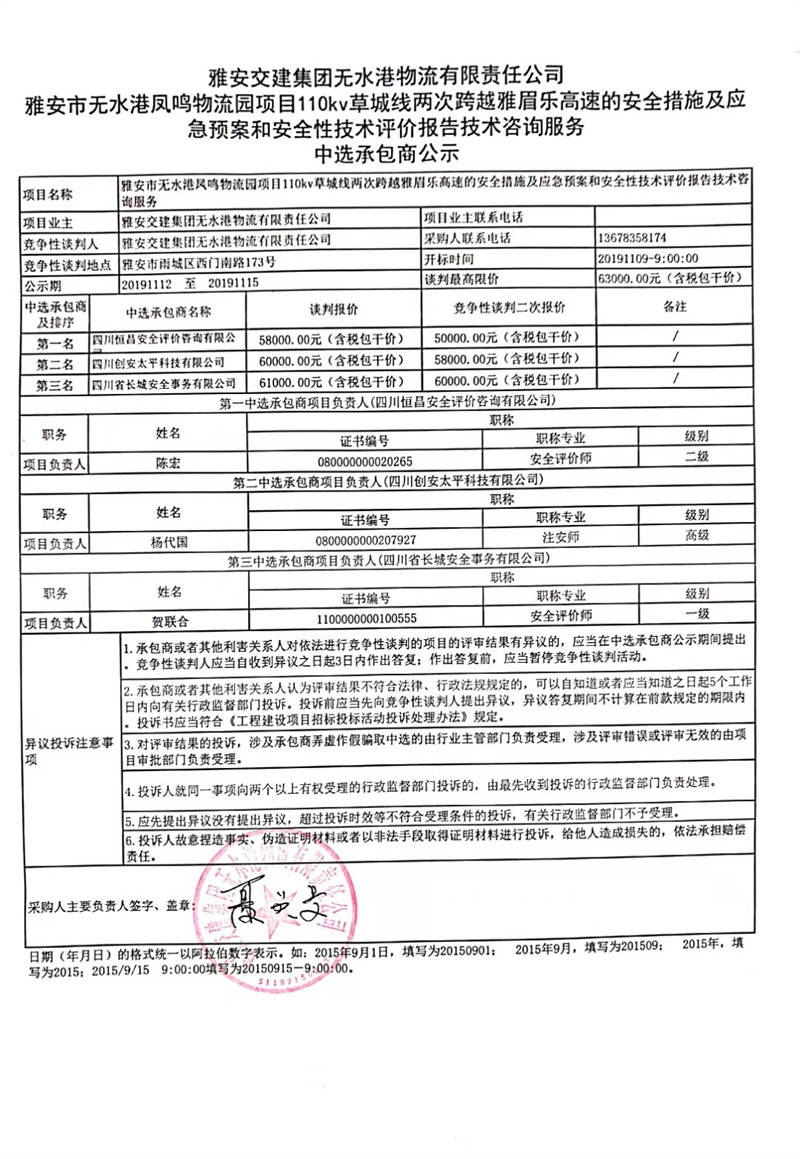 雅安交建集團無水港物流有限責任公司雅安市無水港鳳鳴物流園項目110kv草城線兩次跨越雅眉樂高速的安全措施、應(yīng)急預(yù)案以及安全性技術(shù)評價報告技術(shù)咨詢服務(wù)中選承包商公示