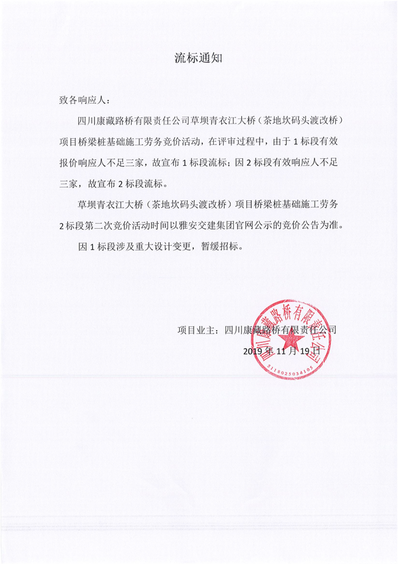 四川康藏路橋有限責(zé)任公司草壩青衣江大橋(茶地坎碼頭渡改橋)項目橋梁樁基礎(chǔ)施工勞務(wù)競價(1標(biāo)段、2標(biāo)段)流標(biāo)通知
