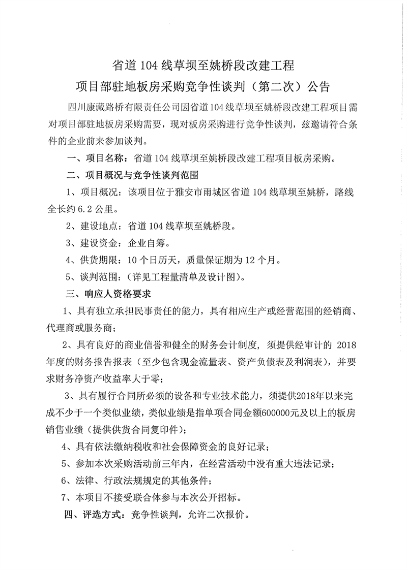 四川康藏路橋有限責任公司省道104線草壩至姚橋段改建工程項目部駐地板房采購競爭性談判(第二次)公告