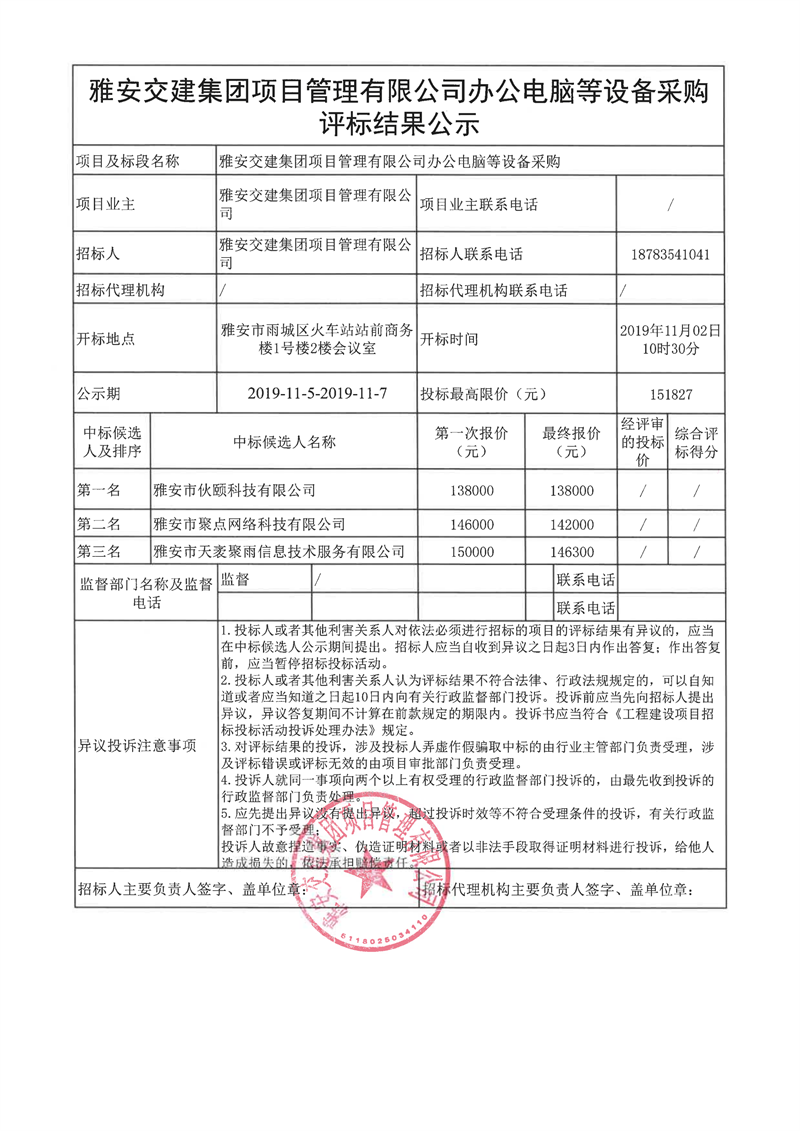 雅安交建集團項目管理有限公司辦公電腦等設(shè)備采購評標(biāo)結(jié)果公示