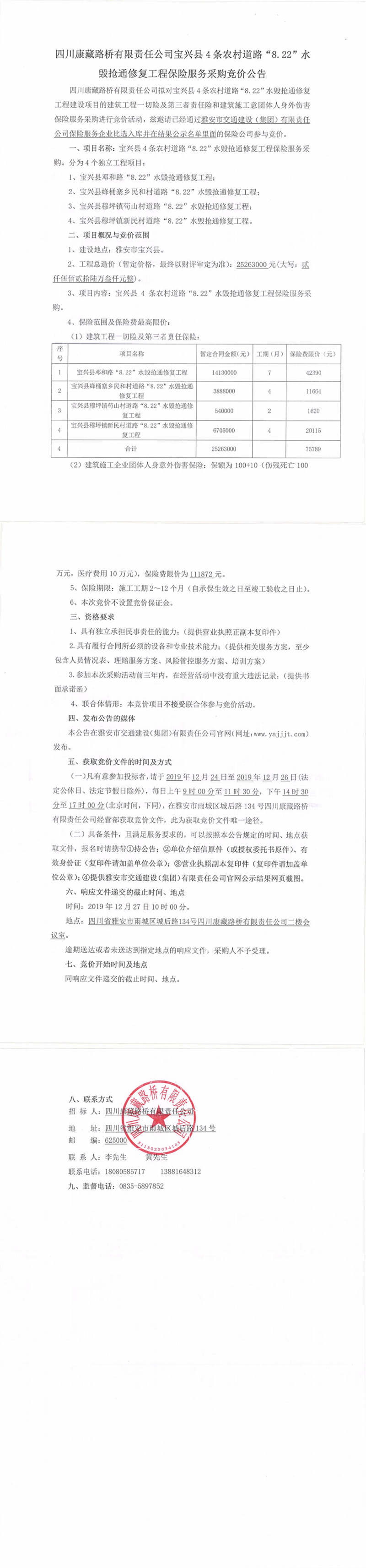 四川康藏路橋有限責(zé)任公司寶興縣4條農(nóng)村道路“8.22”水毀搶通修復(fù)工程保險(xiǎn)服務(wù)采購競價公告