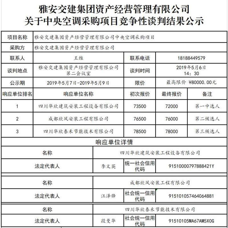 雅安交建集團(tuán)資產(chǎn)經(jīng)營管理有限公司 關(guān)于中央空調(diào)采購項(xiàng)目競(jìng)爭(zhēng)性談判結(jié)果公示
