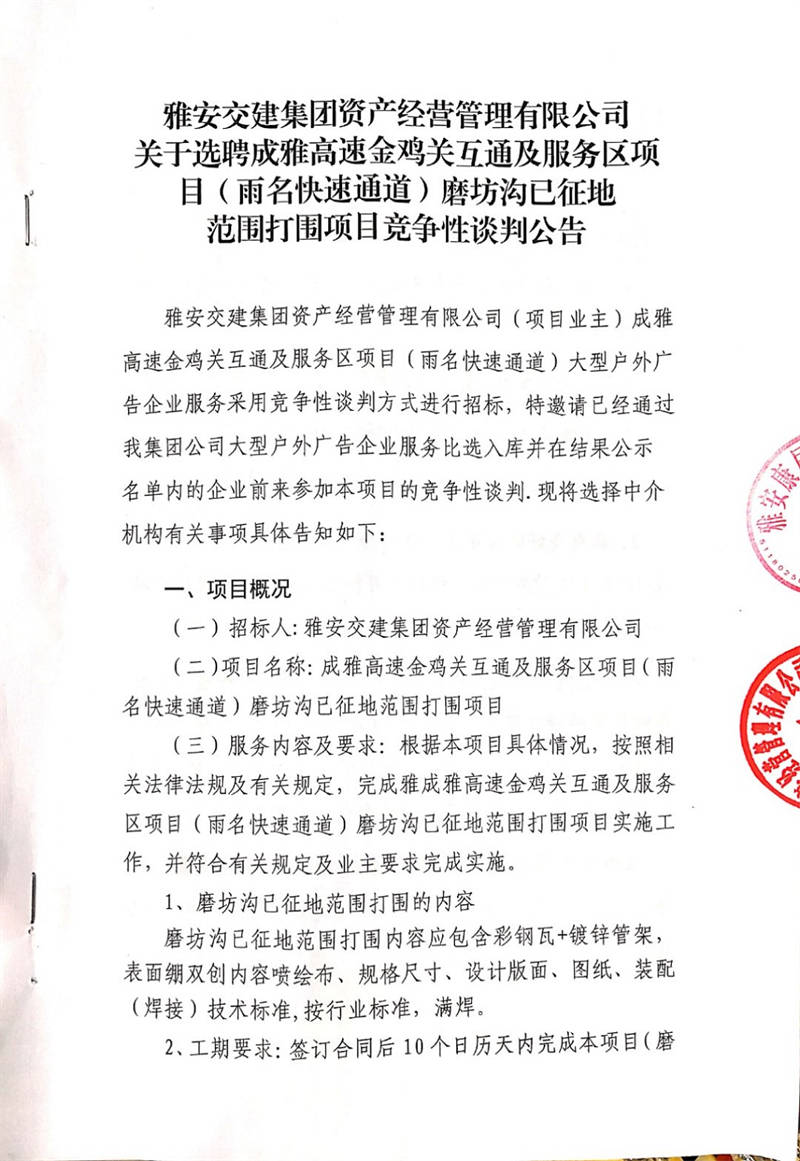 雅安交建集團(tuán)資產(chǎn)經(jīng)營(yíng)管理有限公司關(guān)于選聘成雅高速金雞關(guān)互通及服務(wù)區(qū)項(xiàng)目(雨名快速通道)磨坊溝已征地范圍打圍項(xiàng)目競(jìng)爭(zhēng)性談判公告