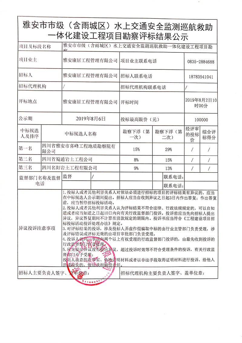 雅安康居工程管理有限公司雅安市市級(含雨城區(qū))水上交通安全監(jiān)測巡航救助一體化建設(shè)工程項(xiàng)目勘察評標(biāo)結(jié)果公示