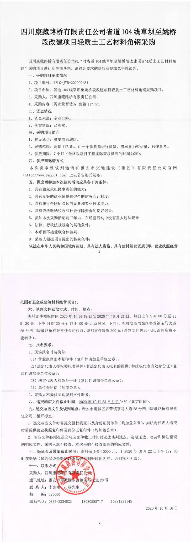 四川康藏路橋有限責任公司省道104線草壩至姚橋段改建項目輕質土工藝材料角鋼采購競爭性談判公告