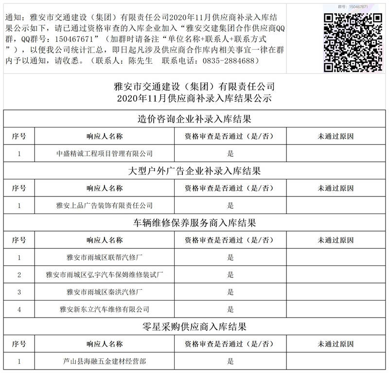 雅安市交通建設(shè)(集團)有限責任公司2020年11月供應商補錄入庫結(jié)果公示