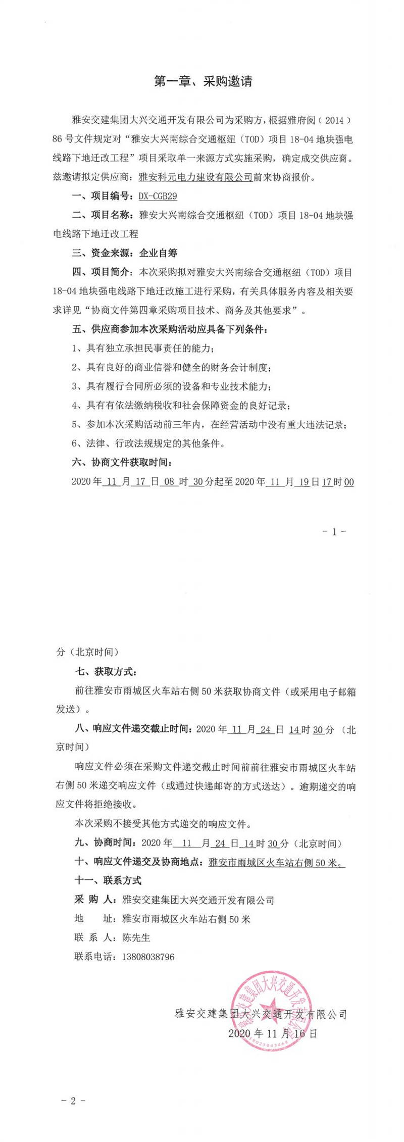 雅安交建集團(tuán)大興交通開發(fā)有限公司雅安大興南綜合交通樞紐(TOD)項(xiàng)目18-04地塊強(qiáng)電線路下地遷改工程單一來(lái)源采購(gòu)邀請(qǐng)