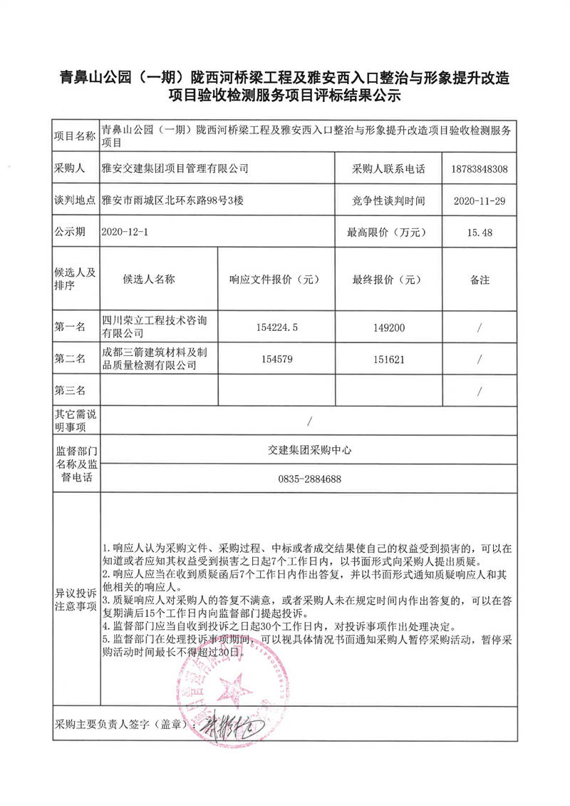 雅安交建集團(tuán)項(xiàng)目管理有限公司青鼻山公園(一期)隴西河橋梁工程及雅安西入口整治與形象提升改造項(xiàng)目驗(yàn)收檢測服務(wù)項(xiàng)目評標(biāo)結(jié)果公示