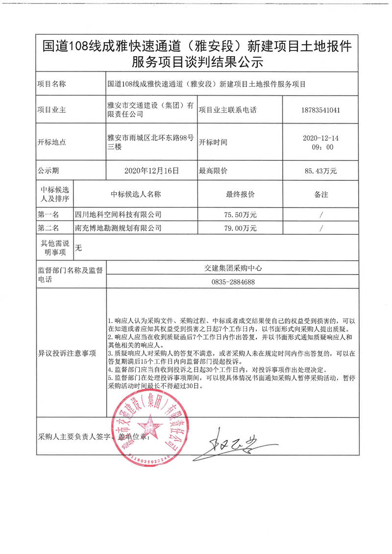 雅安市交通建設(shè)(集團(tuán))有限責(zé)任公司國道108線成雅快速通道(雅安段)新建項(xiàng)目土地報(bào)件服務(wù)項(xiàng)目談判結(jié)果公示