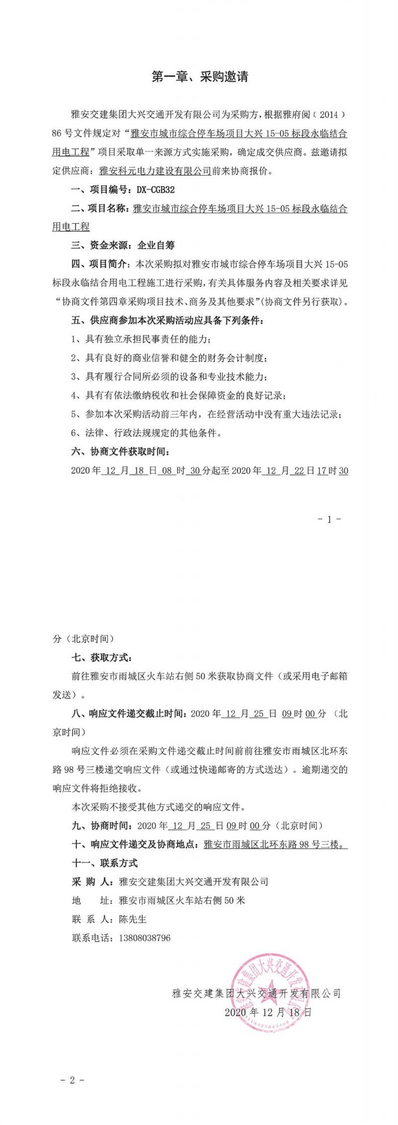 雅安交建集團(tuán)大興交通開發(fā)有限公司雅安市城市綜合停車場項(xiàng)目大興15-05標(biāo)段永臨結(jié)合用電工程單一來源采購邀請