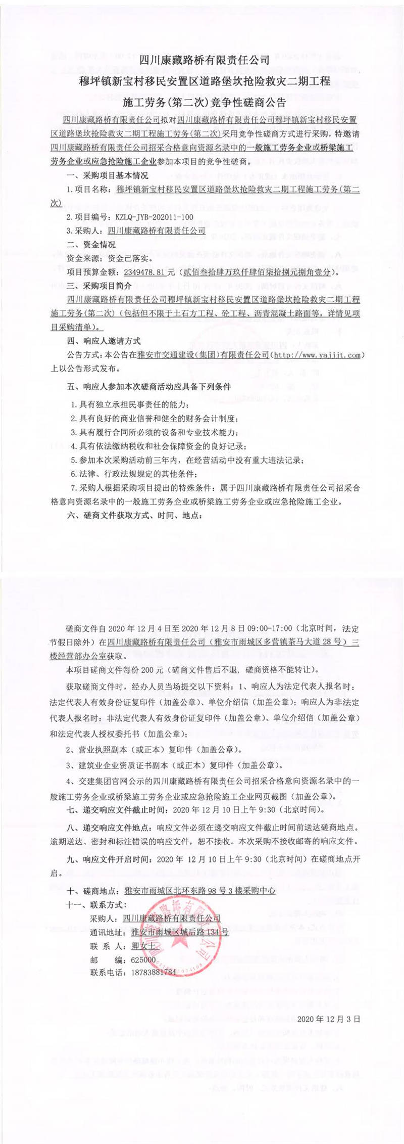 四川康藏路橋有限責任公司穆坪鎮(zhèn)新寶村移民安置區(qū)道路堡坎搶險救災二期工程施工勞務(第二次)競爭性磋商公告