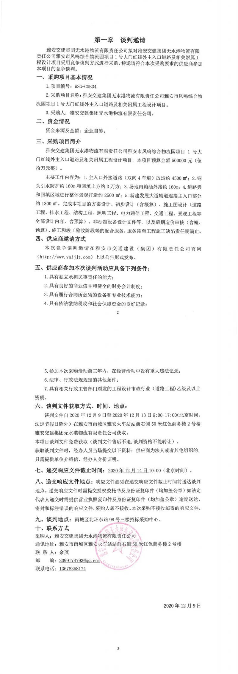 雅安交建集團無水港物流有限責任公司雅安市鳳鳴綜合物流園項目1號大門紅線外主入口道路及相關附屬工程設計項目競爭談判公告