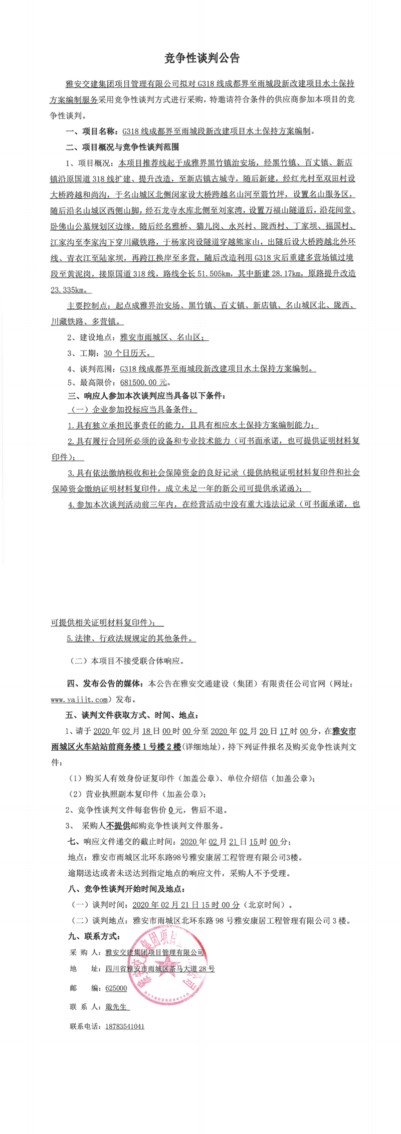 雅安交建集團項目管理有限公司G318線成都界至雨城段新改建項目水土保持方案編制競爭性談判公告