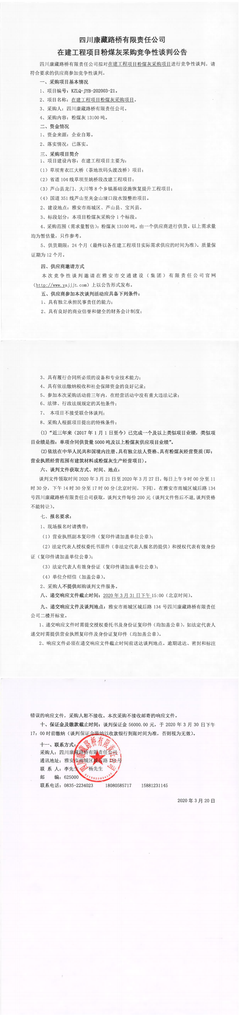 四川康藏路橋有限責任公司在建工程項目粉煤灰采購競爭性談判公告