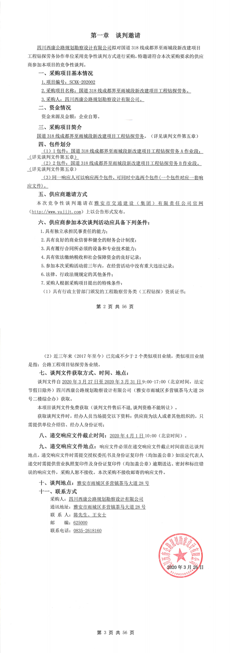 四川西康公路規(guī)劃勘察設(shè)計(jì)有限公司國道318線成都界至雨城段新改建項(xiàng)目工程鉆探勞務(wù)競爭性談判公告