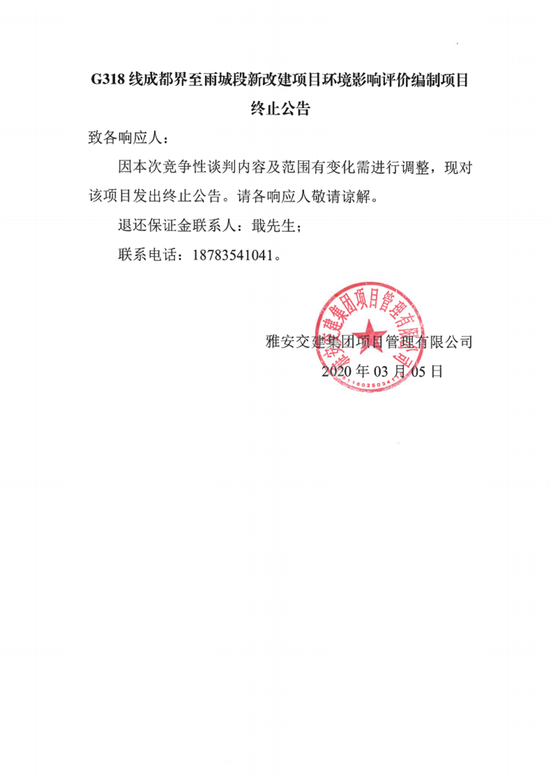 雅安交建集團(tuán)項(xiàng)目管理有限公司G318線(xiàn)成都界至雨城段新改建項(xiàng)目環(huán)境影響評(píng)價(jià)編制項(xiàng)目終止公告