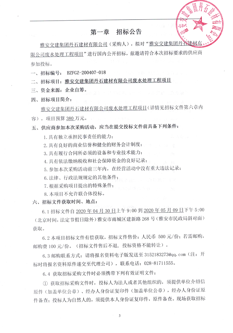 雅安交建集團(tuán)丹石建材有限公司廢水處理工程項目招標(biāo)公告