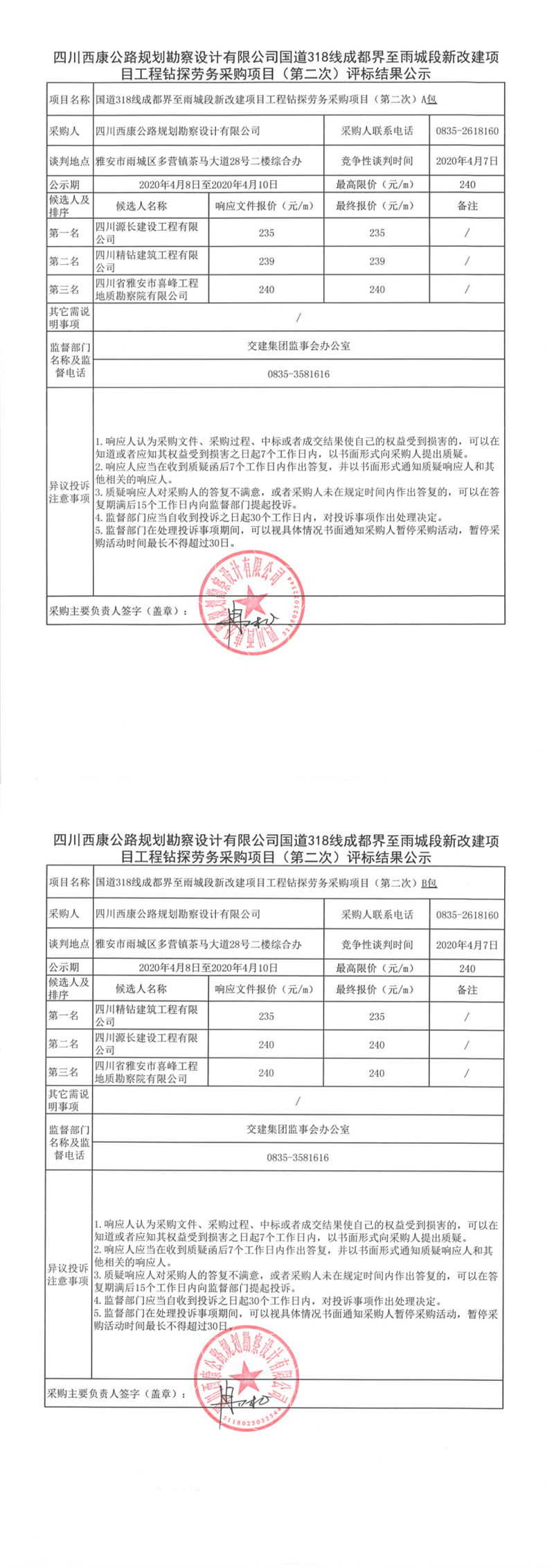 四川西康公路規(guī)劃勘察設(shè)計有限公司國道318線成都界至雨城段新改建項目工程鉆探勞務(wù)采購項目(第二次)評標(biāo)結(jié)果公示