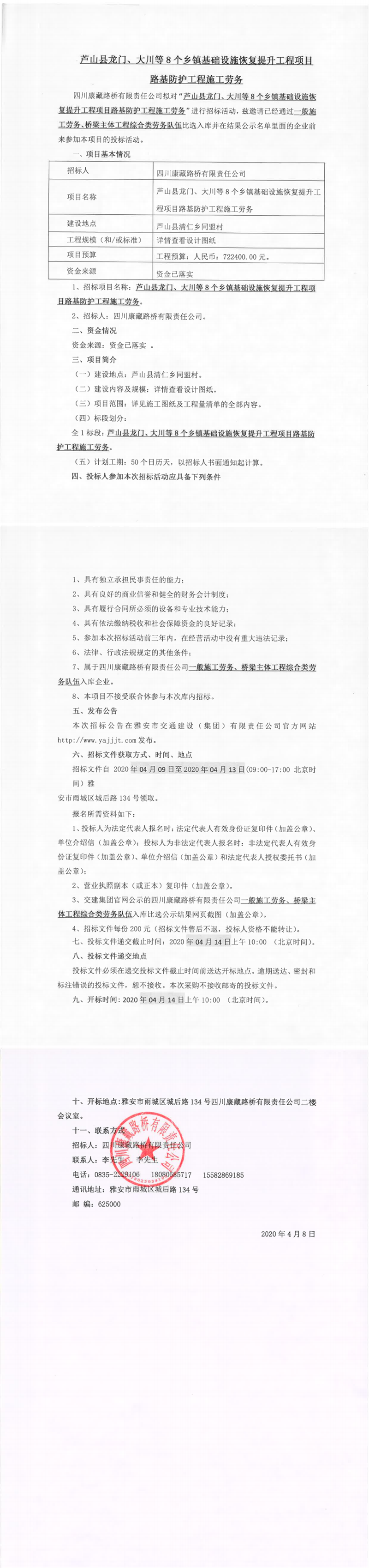 四川康藏路橋有限責任公司蘆山縣龍門、大川等8個鄉(xiāng)鎮(zhèn)基礎設施恢復提升工程項目路基防護工程施工勞務招標公告