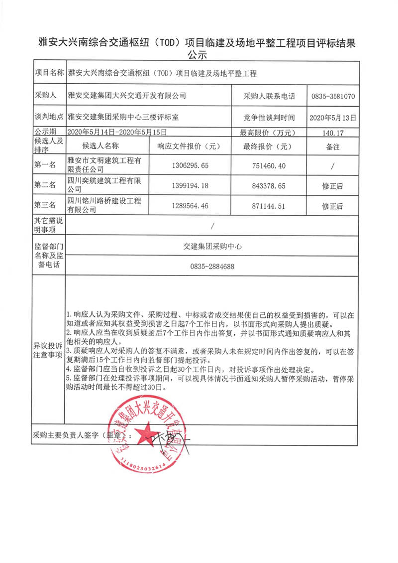 雅安交建集團(tuán)大興交通開發(fā)有限公司雅安大興南綜合交通樞紐(TOD)項(xiàng)目臨建及場地平整工程項(xiàng)目評標(biāo)結(jié)果公示