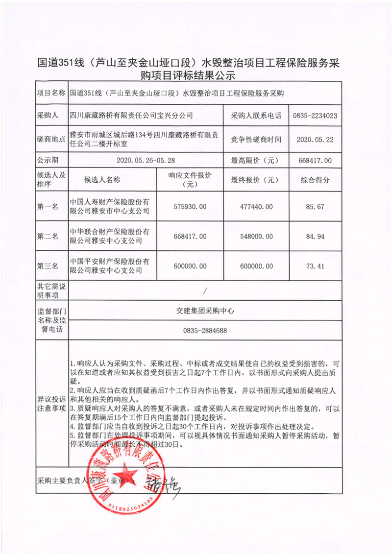 四川康藏路橋有限責(zé)任公司寶興分公司國(guó)道351線(蘆山至夾金山埡口段)水毀整治項(xiàng)目工程保險(xiǎn)服務(wù)采購(gòu)項(xiàng)目評(píng)標(biāo)結(jié)果公示