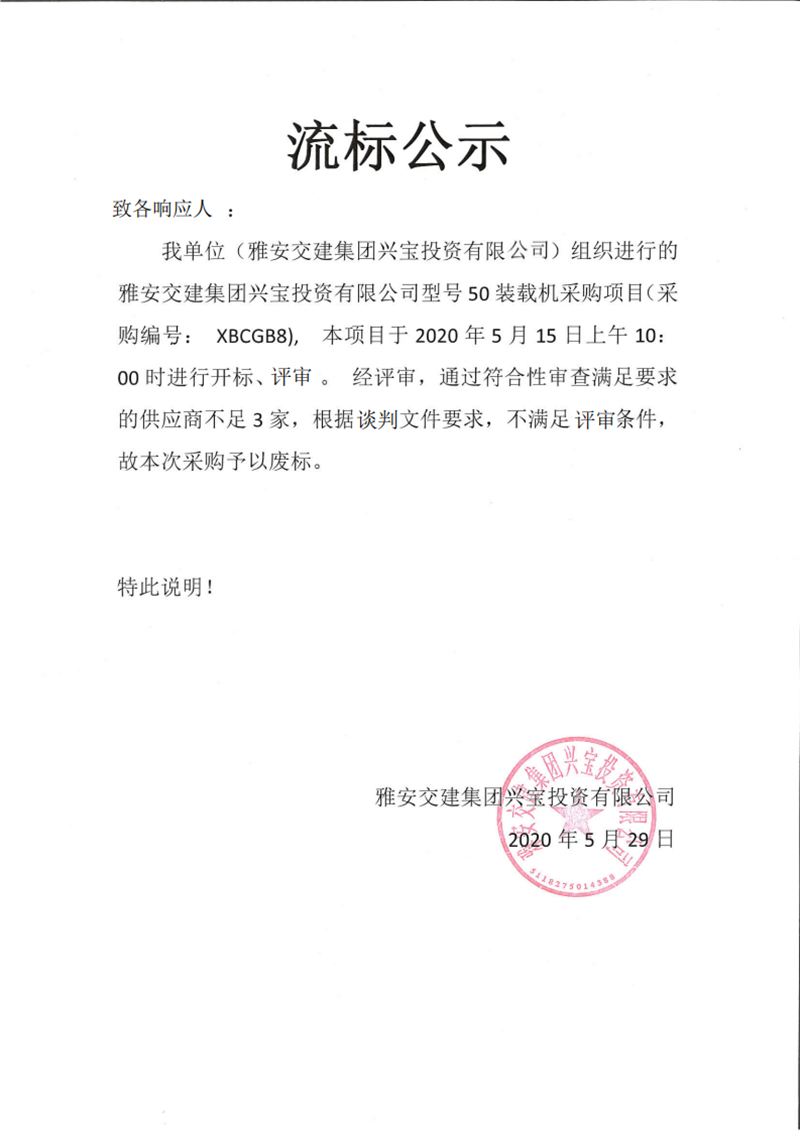 雅安交建集團興寶投資有限公司型號50裝載機采購項目流標(biāo)公示