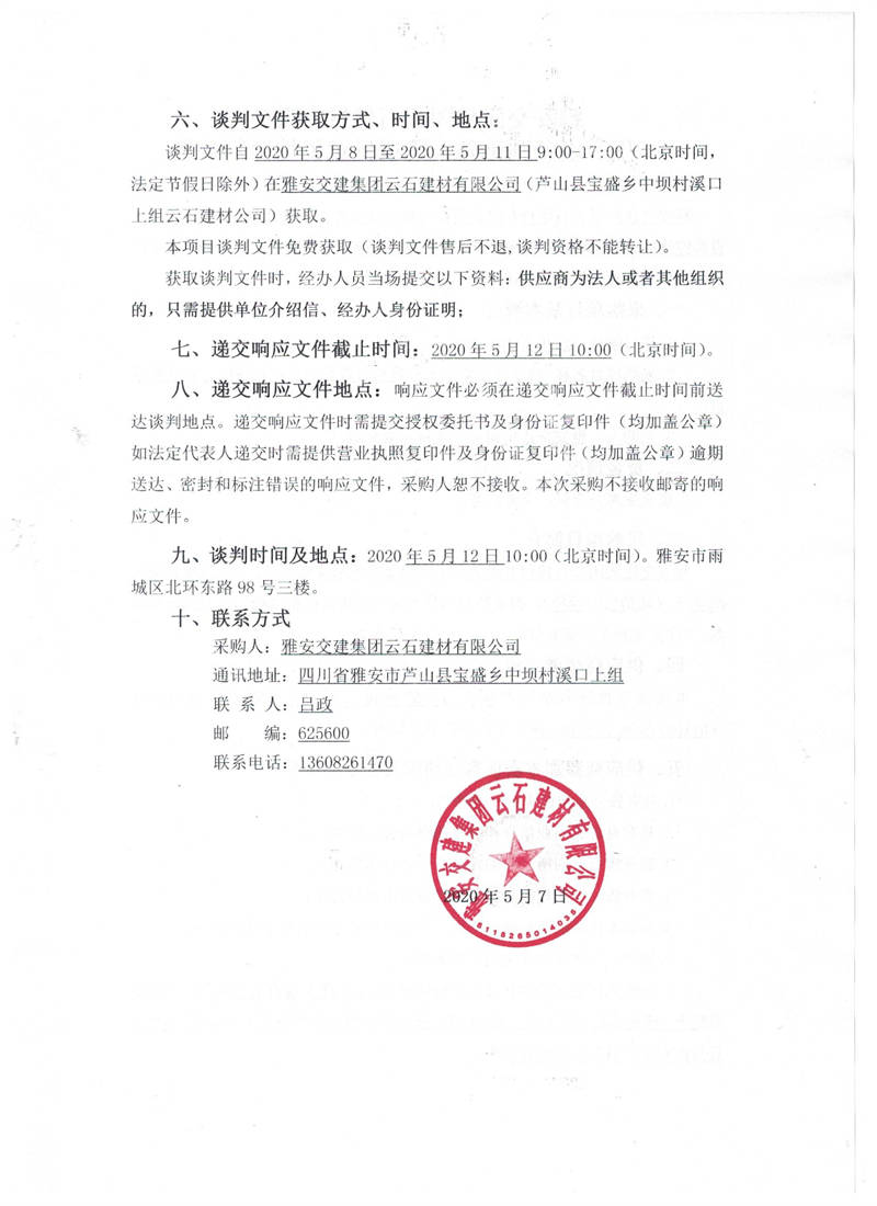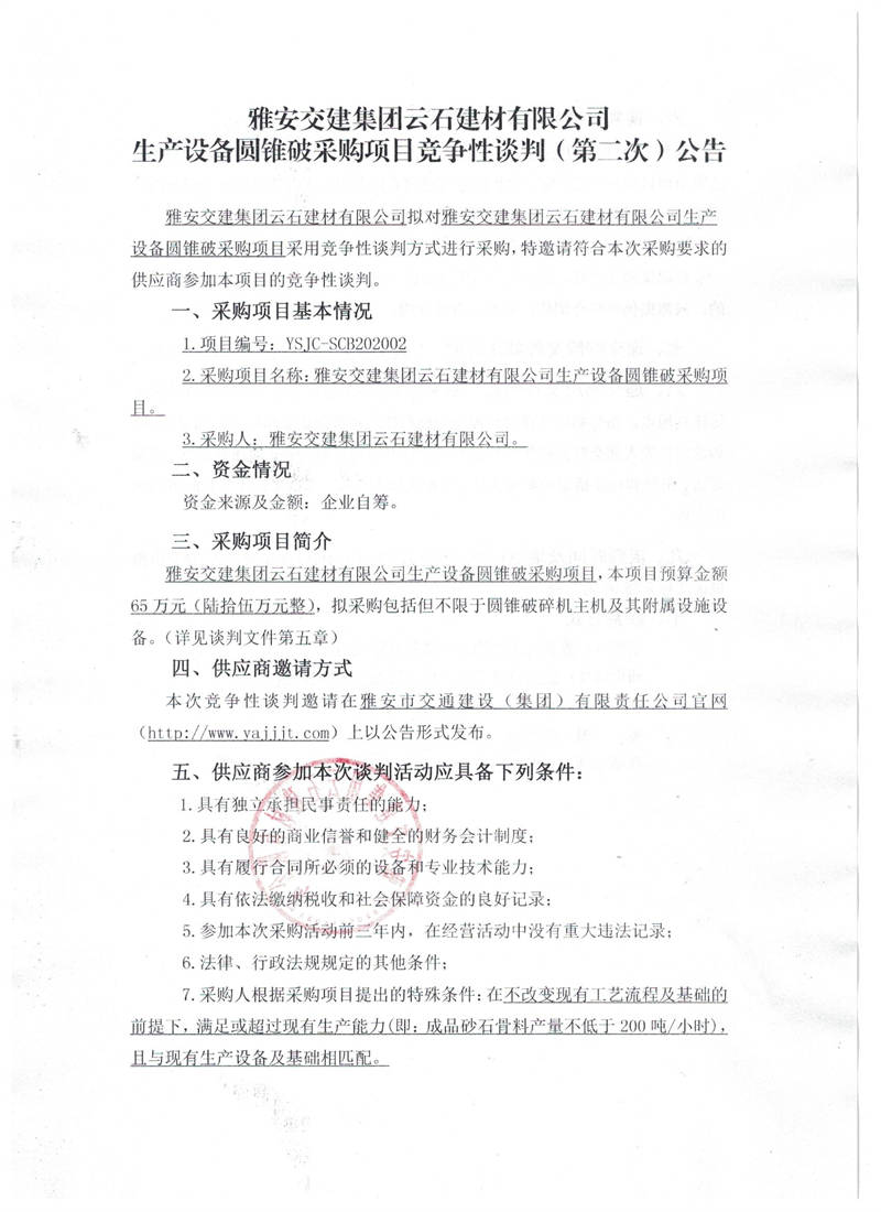 雅安交建集團云石建材有限公司生產(chǎn)設備圓錐破采購項目競爭性談判(第二次)公告