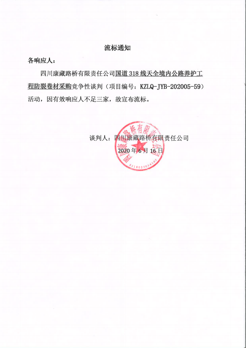 四川康藏路橋有限責任公司國道318線天全境內(nèi)公路養(yǎng)護工程防裂卷材采購流標通知