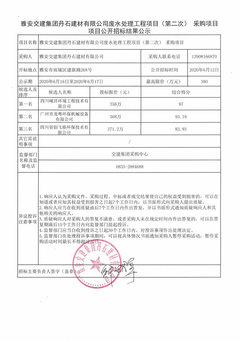 雅安交建集團丹石建材有限公司廢水處理工程項目(第二次)采購項目公開招標結果公示
