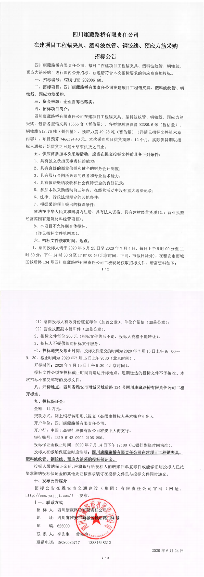 四川康藏路橋有限責任公司在建項目工程錨夾具、塑料波紋管、鋼鉸線、預(yù)應(yīng)力筋采購招標公告