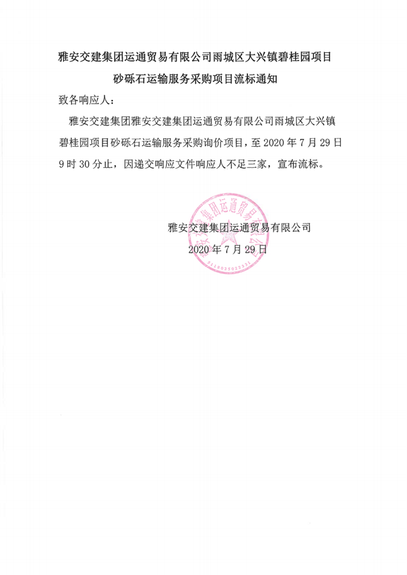 雅安交建集團運通貿(mào)易有限公司雨城區(qū)大興鎮(zhèn)碧桂園砂礫石運輸服務(wù)采購項目流標(biāo)通知
