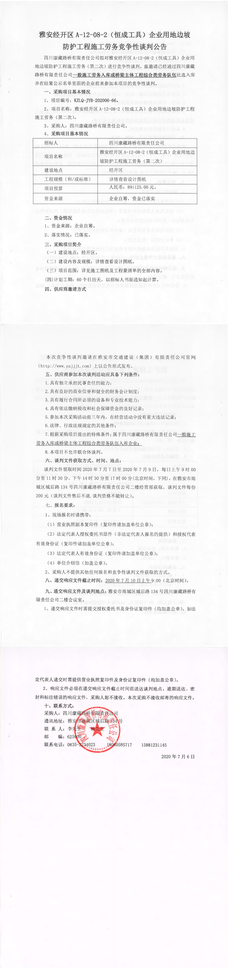 四川康藏路橋有限責(zé)任公司雅安經(jīng)開(kāi)區(qū)A-12-08-2(恒成工具)企業(yè)用地邊坡防護(hù)工程施工勞務(wù)(第二次)競(jìng)爭(zhēng)性談判公告