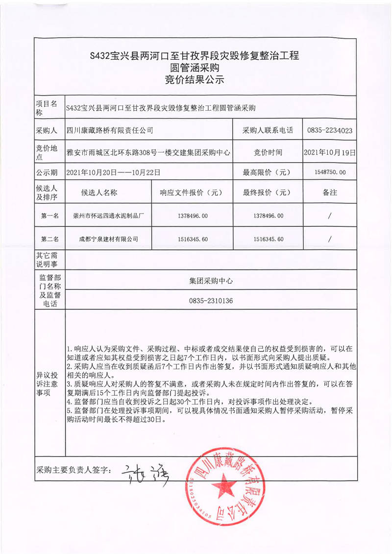 四川康藏路橋有限責(zé)任公司S432線寶興縣兩河口至甘孜界段災(zāi)毀修復(fù)整治工程圓管涵采購(gòu)競(jìng)價(jià)結(jié)果公示