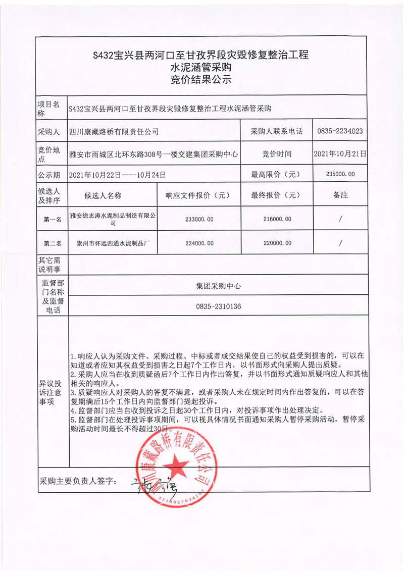 四川康藏路橋有限責(zé)任公司S432線寶興縣兩河口至甘孜界段災(zāi)毀修復(fù)整治工程水泥涵管采購(gòu)競(jìng)價(jià)結(jié)果公示