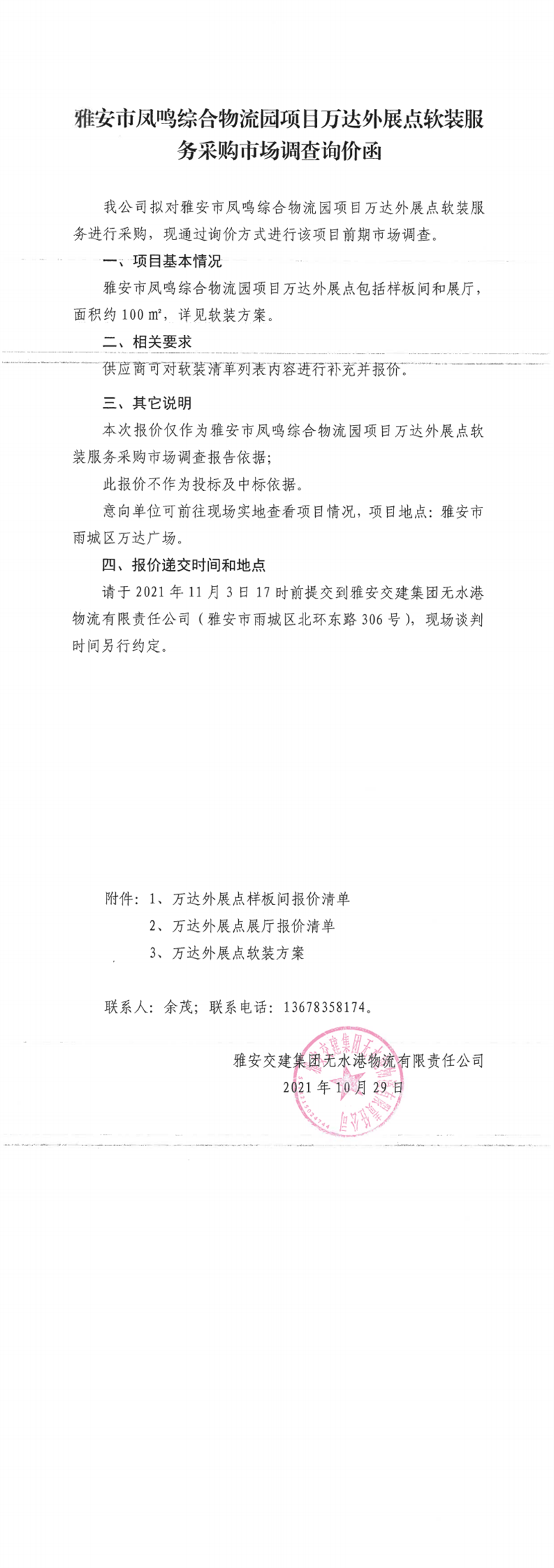 雅安交建集團無水港物流有限責任公司雅安市鳳鳴綜合物流園項目萬達外展點軟裝服務采購市場調(diào)查詢價函