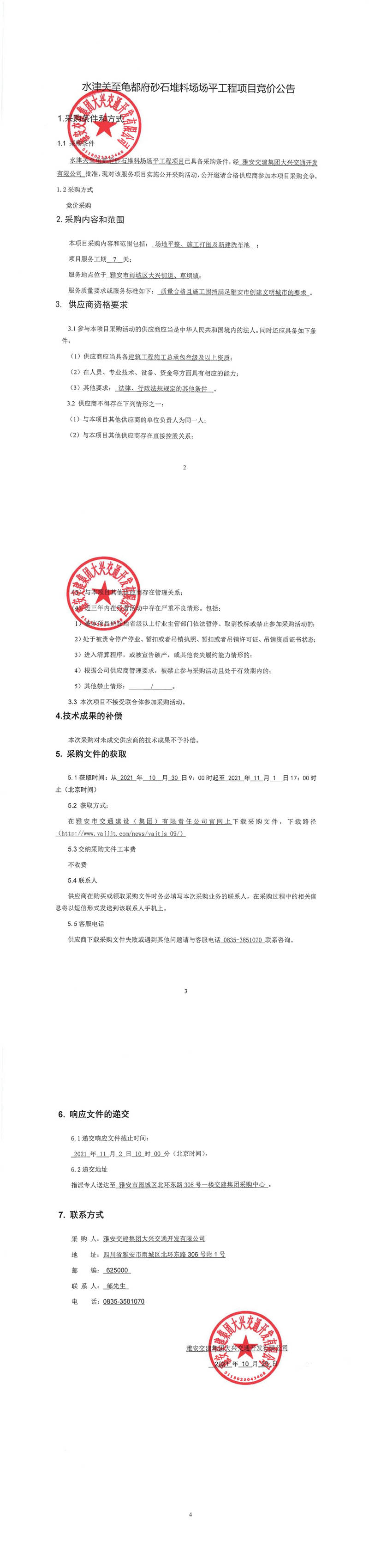 雅安交建集團(tuán)大興交通開(kāi)發(fā)有限公司水津關(guān)至龜都府砂石堆料場(chǎng)場(chǎng)平工程項(xiàng)目競(jìng)價(jià)公告