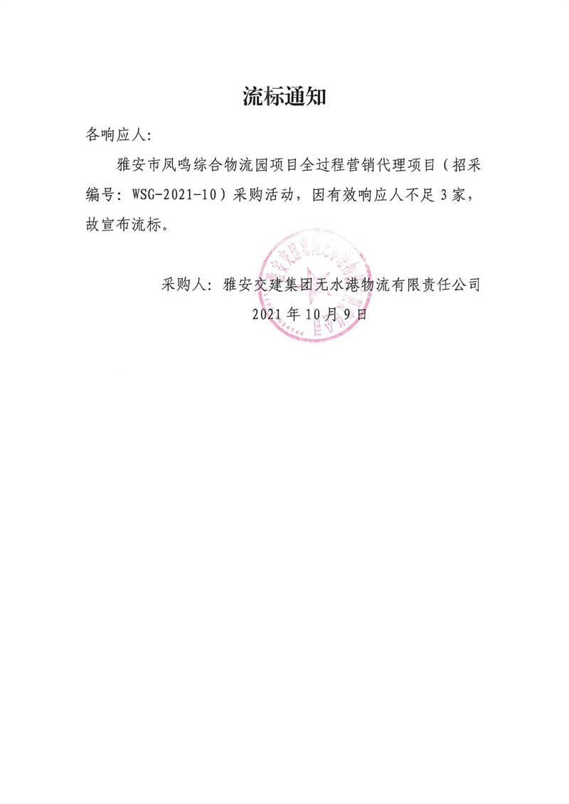 雅安交建集團(tuán)無(wú)水港物流有限責(zé)任公司雅安市鳳鳴綜合物流園項(xiàng)目全過(guò)程營(yíng)銷代理項(xiàng)目流標(biāo)通知