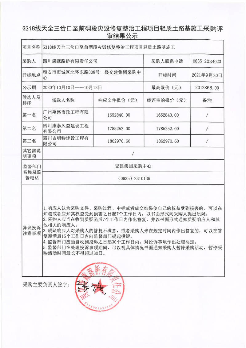 四川康藏路橋有限責任公司G318線天全三岔口至前碉段災毀修復整治工程項目輕質(zhì)土路基施工采購評審結(jié)果公示