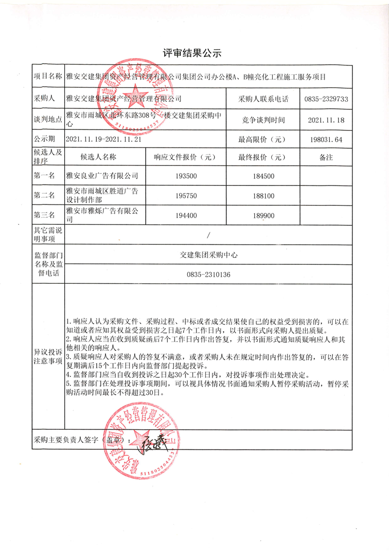雅安交建集團資產經營管理有限公司集團公司辦公樓A、B幢亮化工程施工服務項目評審結果公示