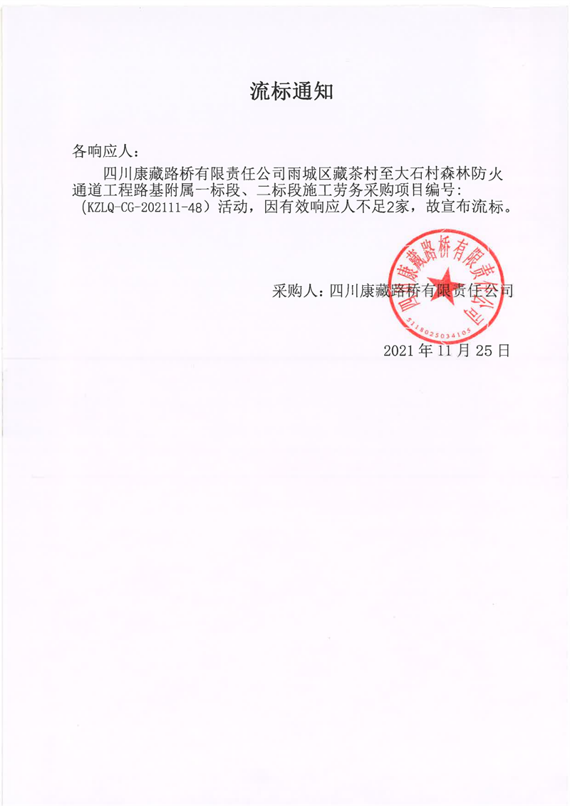 四川康藏路橋有限責(zé)任公司雨城區(qū)藏茶村至大石村森林防火通道工程路基附屬一標段、二標段施工勞務(wù)流標通知