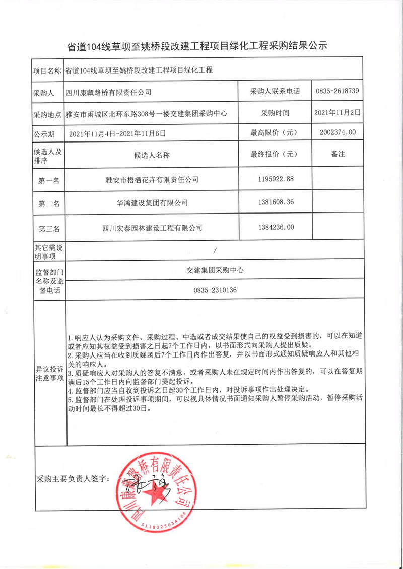 四川康藏路橋有限責(zé)任公司省道104線草壩至姚橋段改建工程項(xiàng)目綠化工程采購(gòu)結(jié)果公示