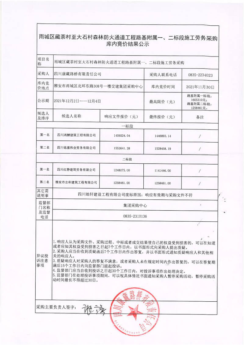 四川康藏路橋有限責(zé)任公司雨城區(qū)藏茶村至大石村森林防火通道工程路基附屬一、二標(biāo)段施工勞務(wù)采購庫內(nèi)競價結(jié)果公示
