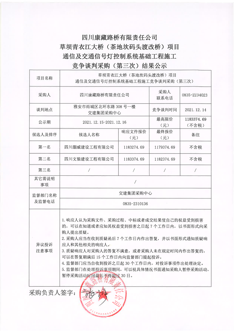 四川康藏路橋有限責任公司草壩青衣江大橋(茶地坎碼頭渡改橋)項目通信及交通信號燈控制系統(tǒng)基礎工程施工競爭談判采購(第三次)結果公示