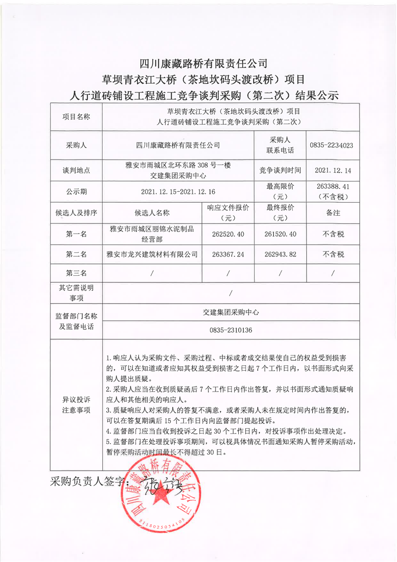 四川康藏路橋有限責(zé)任公司草壩青衣江大橋(茶地坎碼頭渡改橋)項(xiàng)目人行道磚鋪設(shè)工程施工競爭談判采購(第二次)結(jié)果公示