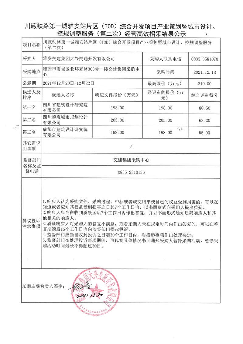 雅安交建集團大興交通開發(fā)有限公司川藏鐵路第一城雅安站片區(qū)(TOD)綜合開發(fā)項目產(chǎn)業(yè)策劃暨城市設計、控規(guī)調(diào)整服務(第二次)經(jīng)營高效招采結果公示
